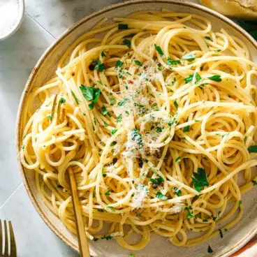 Aquí tienes una de esas recetas de bolsillo que puedes guardar como favorita cuando tengas poco tiempo: Fideos con mantequilla de ajo ! Esta pasta fácil utiliza principalmente ingredientes de la despensa y es rápida y sencilla de preparar en solo 20 minutos. ¡Dale un mordisco a esta pila de pasta tibia y mantecosa y será pura felicidad! Este funciona tanto para niños como para adultos: es sofisticado y elegante pero al mismo tiempo mantecoso y sabroso (siempre que a su hijo le guste el ajo, ¡que al nuestro le encanta!).