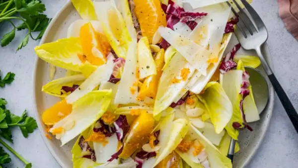 ¡Esta receta de ensalada de escarola es una mezcla refrescante, picante y dulce! Combina este verde amargo con vinagreta de naranja, parmesano y vino tinto.