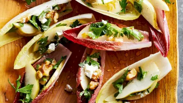 Crédito de la foto: www.bhg.com¿Necesitas una idea divertida para el aperitivo? ¡Prueba la escarola rellena! El queso de cabra, las rodajas de pera y las nueces picadas se combinan para obtener un delicioso relleno de escarola rellena.