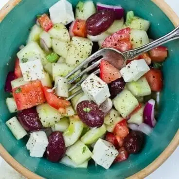 Esta ensalada de pastor es una mezcla tradicional de pepino, tomate, aceitunas y queso feta con jugo de limón y aceite de oliva: ¡una ensalada de verano perfectamente fácil!