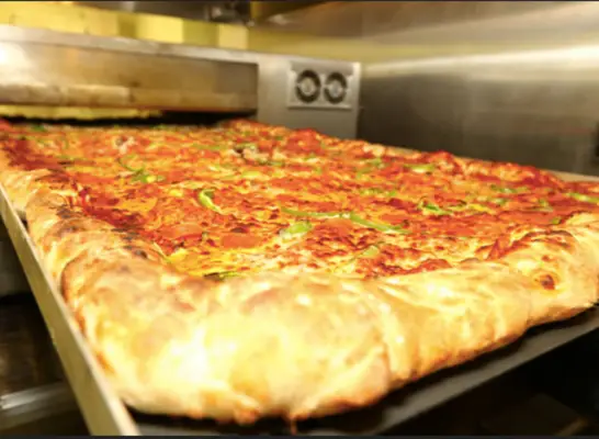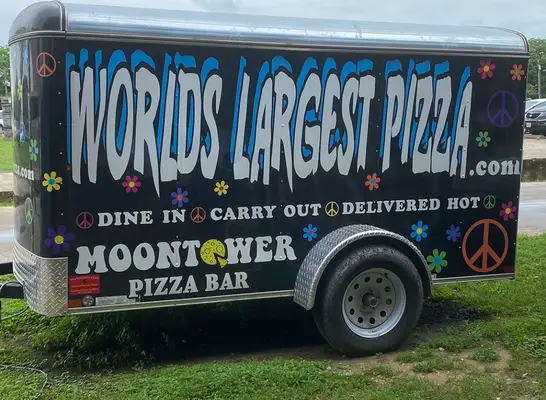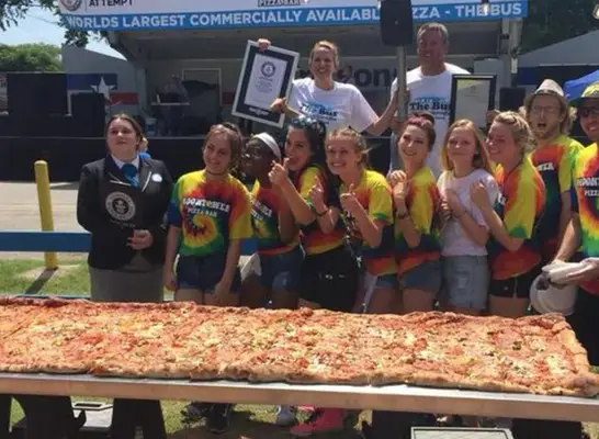 La pizza más grande de Estados Unidos, que se muestra aquí, se puede encontrar en un restaurante en Burleson, Texas, un suburbio de Fort Worth. El Bar de Pizza Moontower de propiedad familiar rompió el récord mundial Guinness 2018 para la pizza más grande disponible comercialmente como una hoja de ocho pies por 32 pulgadas.